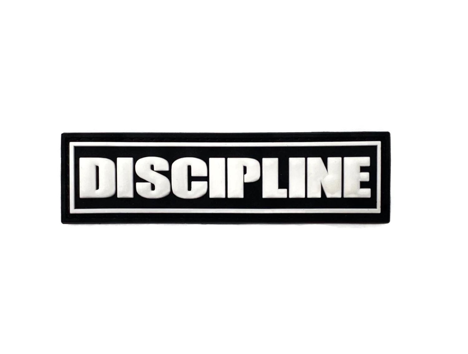 Discipline rubber velcro patch with black background and white letttering.